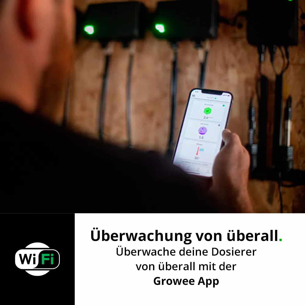 Der Growee Starter Combo umfasst 2 Nährstoffdosierpumpen für die automatische Nährstoffdosierung, ein duales pH-Kontrollsystem für eine intelligente pH-Steuerung nach oben und unten, Wi-Fi-Konnektivität und eine mobile App.
